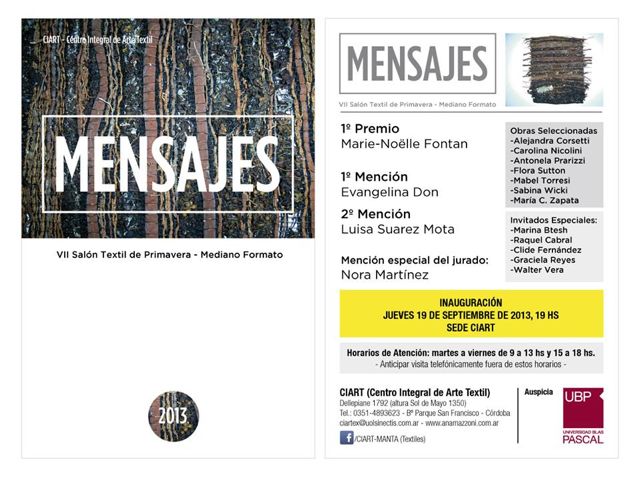Córdoba, Argentina. The Argentine Textile Art Center (CIART) announces the inauguration of its 7th Spring Textile Salon: Medium-size Format, which will be held on Thursday, September 19 at 7:00 pm at CIART. After that date, the exhibit will remain open to the public on a Tuesday to Friday 9-1& 3-6 schedule. MESSAGES features the work of 16 textile artists, and awards its First Prize to Marie-Noëlle Fontan from France.