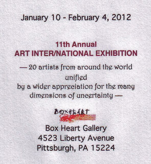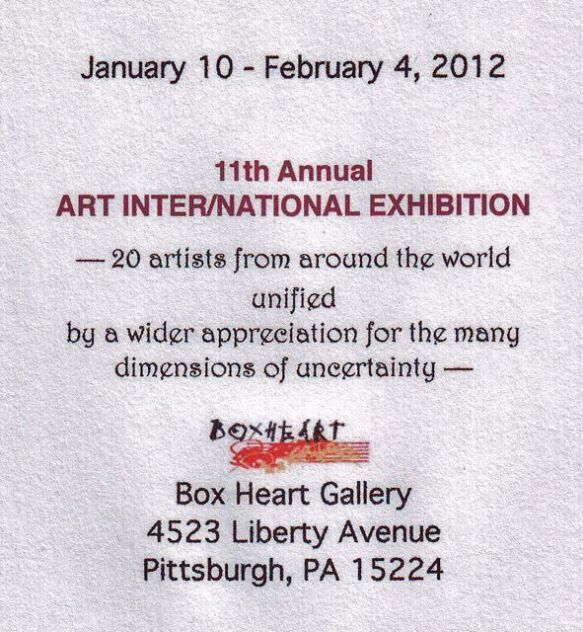 • 11th Art Inter/National Exhibition, Pittsburgh, Pennsylvania, USA, http://www.boxheart.org January 2012.