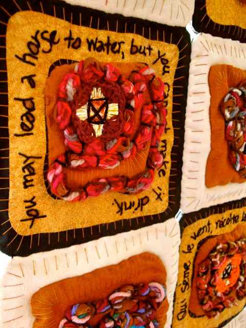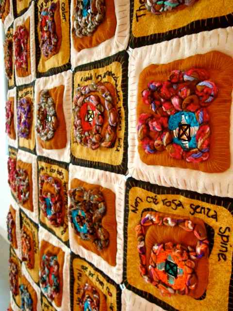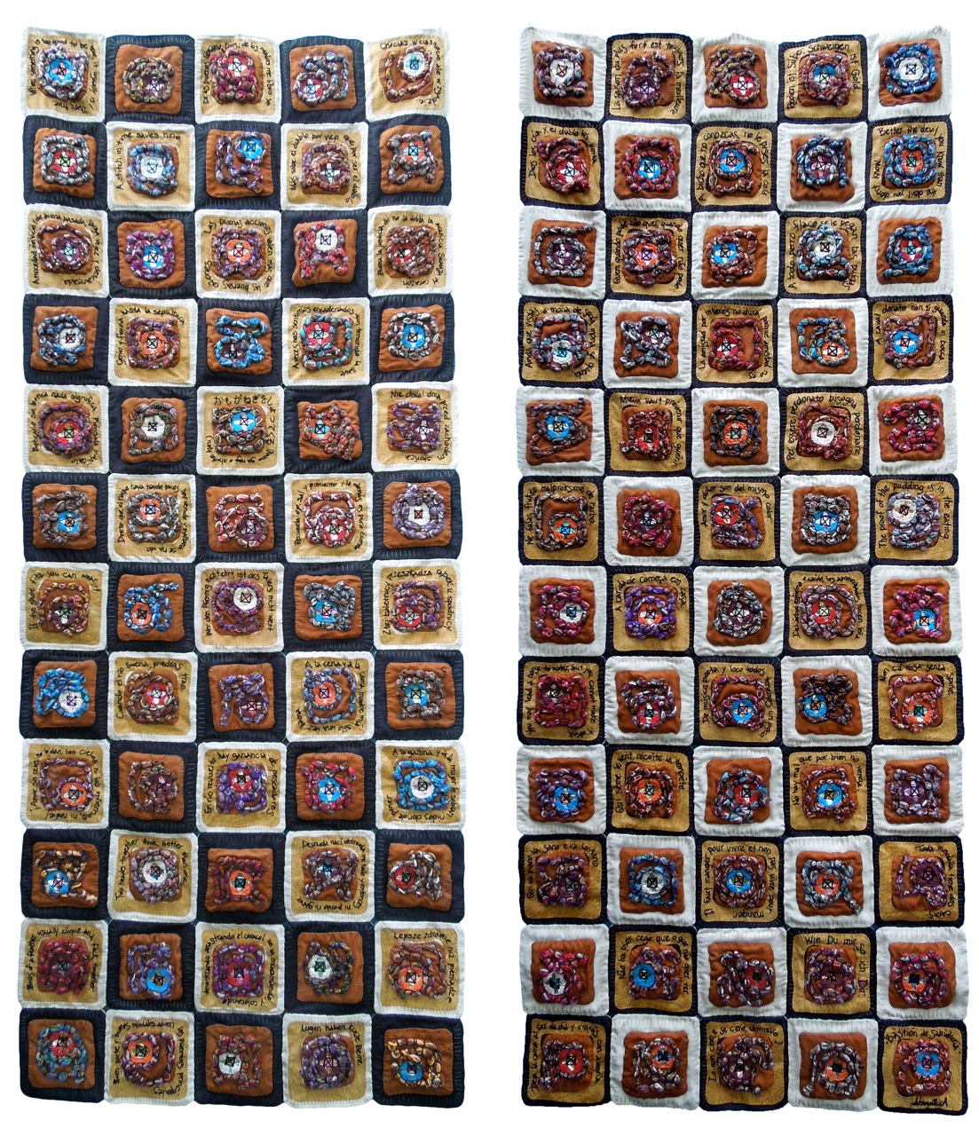 CONTEXTILE stands out by its proposed interaction between artists, creators, industry, community, and the city of Guimarães, which intends to strengthen the economy through innovation, creativity and appreciation of the textile identities of participating territories. Within the frame of this biennale’s social character, Silvia Piza-Tandlich offers artwork that is interactive with the public: “Bastion of Wisdom” is a double-sided piece showing hand embroidered proverbs in nine languages. She explains that refrains and proverbs exist in all cultures and become popular wisdom, with homologous concepts from language to language. The piece also has metal from tee-light candles, representing the whimsical human culture of wishing, and knowing.
